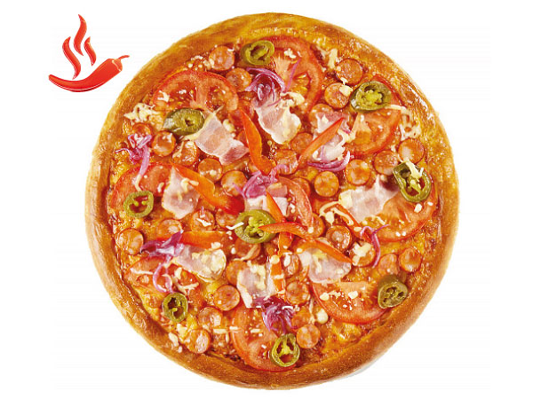Тесто для пиццыбеконколбаска Карпатскаяперец болгарскийлукпомидорперец халапеньопродукт Российский продукт Моцарелласоус
