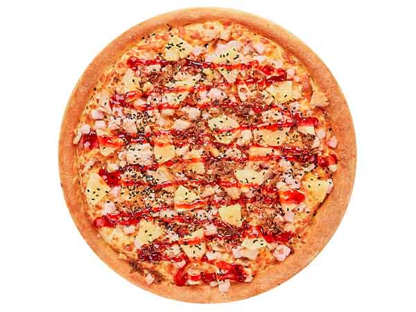 Тесто для пиццыкурица копченаякуриное филе фриананас консервированныйлук фрикунжутпродут Российскийпродукт Моцарелласоус альфредосоус сеульский